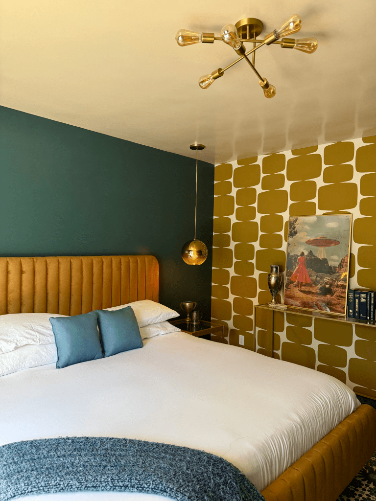 With my key waiting for me in the door, I pushed open the glass swinging doors and stepped into what felt like a portal to another era—one that effortlessly blends the classic mid-century elegance of Palm Springs with a vibrant, retro-chic twist. Every detail was thoughtfully curated, from the patterned tiles and wallpaper to the antique pieces gracing the dressers and walls, all reflecting Jessica’s passion for thrifting—a love we instantly bonded over. One of my favorite touches was the hanging dresses in the closet, which made the space feel less like a hotel room and more like a lived-in retreat. They even provided a dog bed and bowl, anticipating my stay with a pet. And to top it all off, the cozy king-size bed was pure comfort, giving me the best night of sleep.